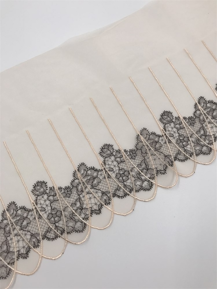 Вышивка на сетке бежевый/черный, ширина 21 см, неэластичная, мягкая, правая сторона.