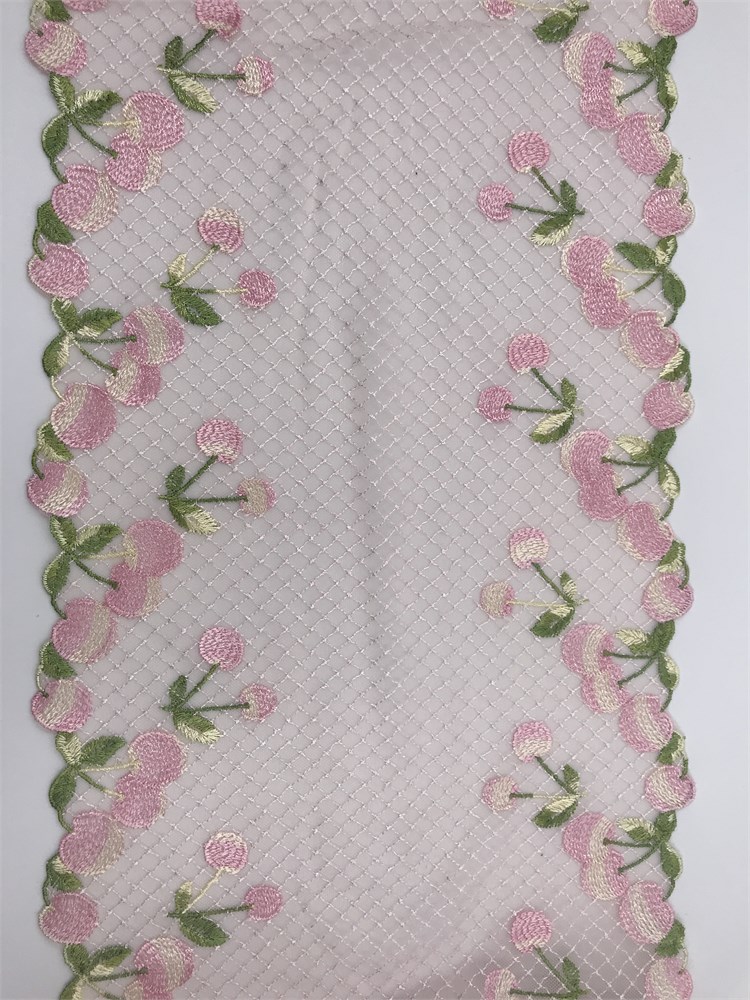 Вышивка на сетке розовые вишни/молочный, ширина 24 см, неэластичная